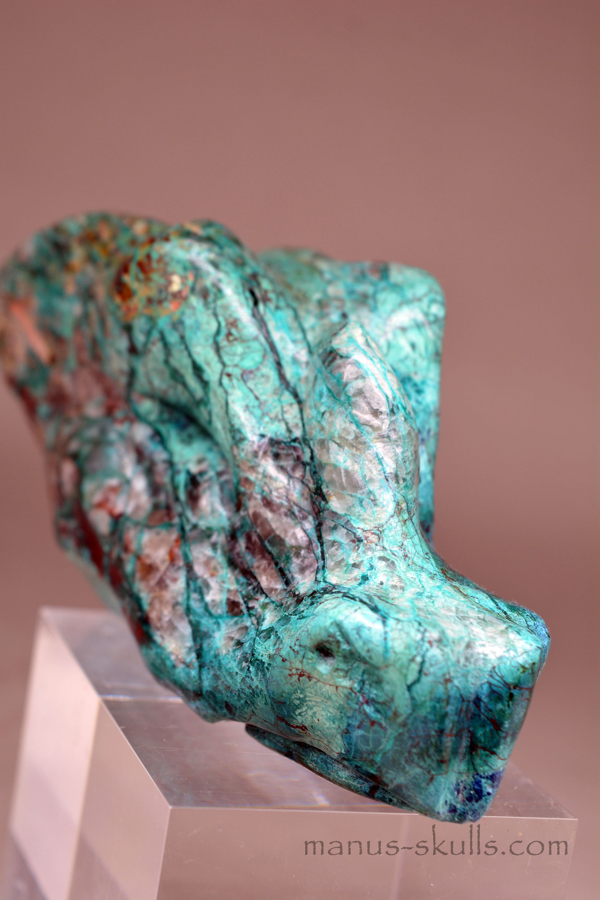 Quantum Quattro is a very difficult stone to carve due to the fact that each stone has its own hardness, that varies from 2 - 6 on the Mohs scale. Hence the fact you do not see many Skulls or Dragons made of this stone combination. Crackes and (small) chips are always to be seen. But each Manus Skull or Dragon is considered to be solid and consistend when they are ready to fly out. They do however need to be treated with the best of care and respect.