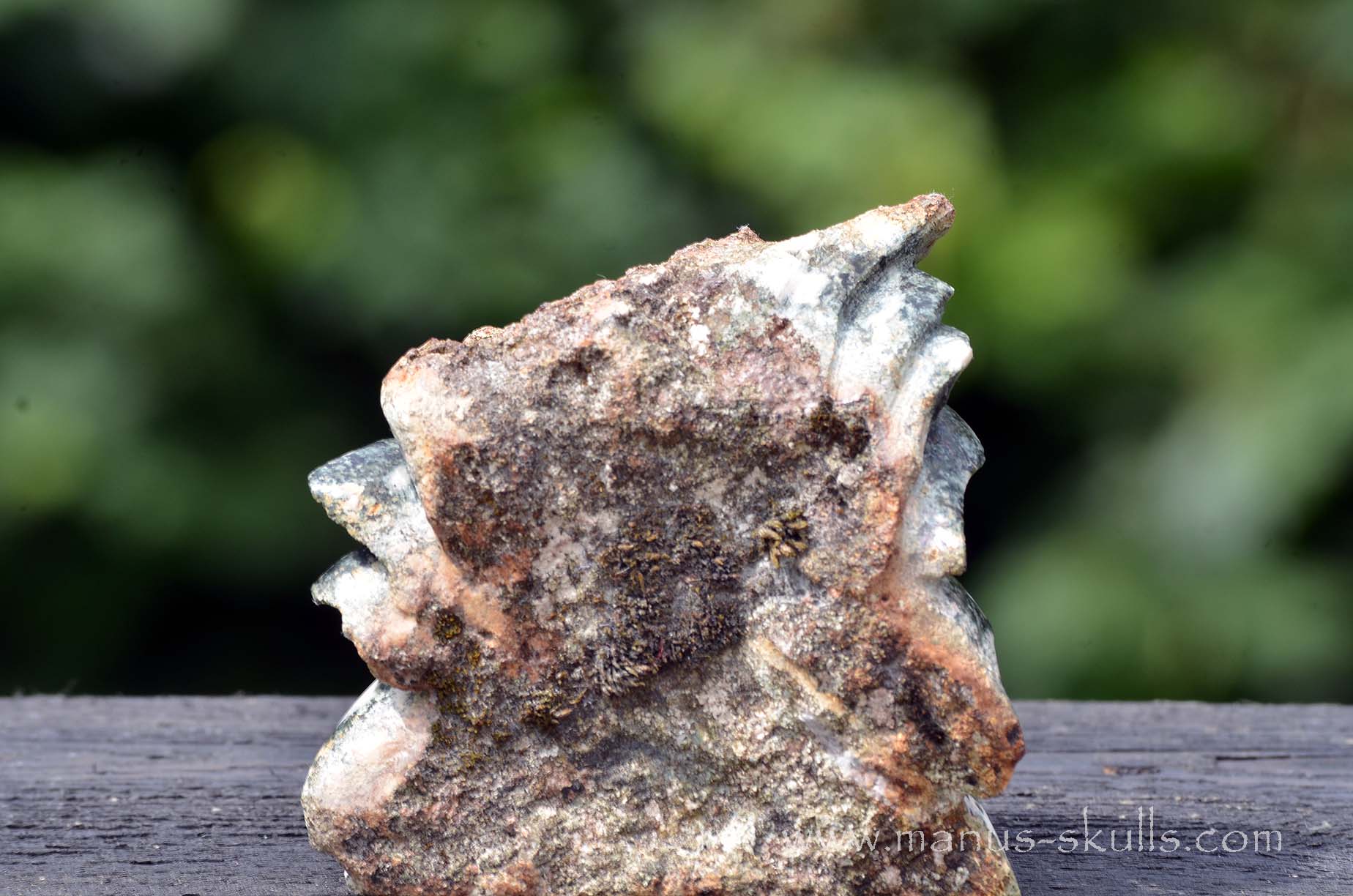 Untouched back and top, from the original outer layer of the stone, does include traces of (active) moss. Keep it wet and it will fully return.