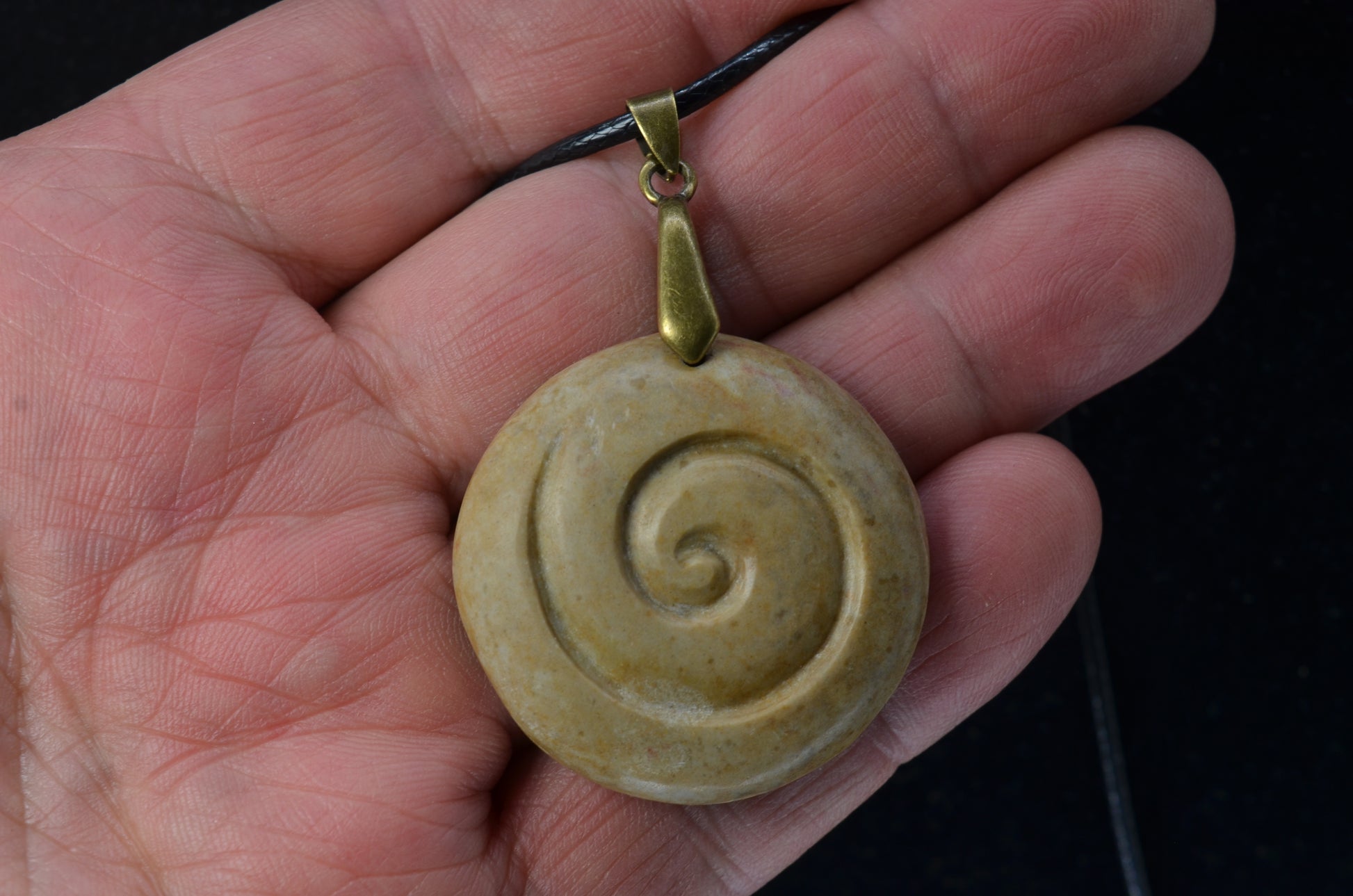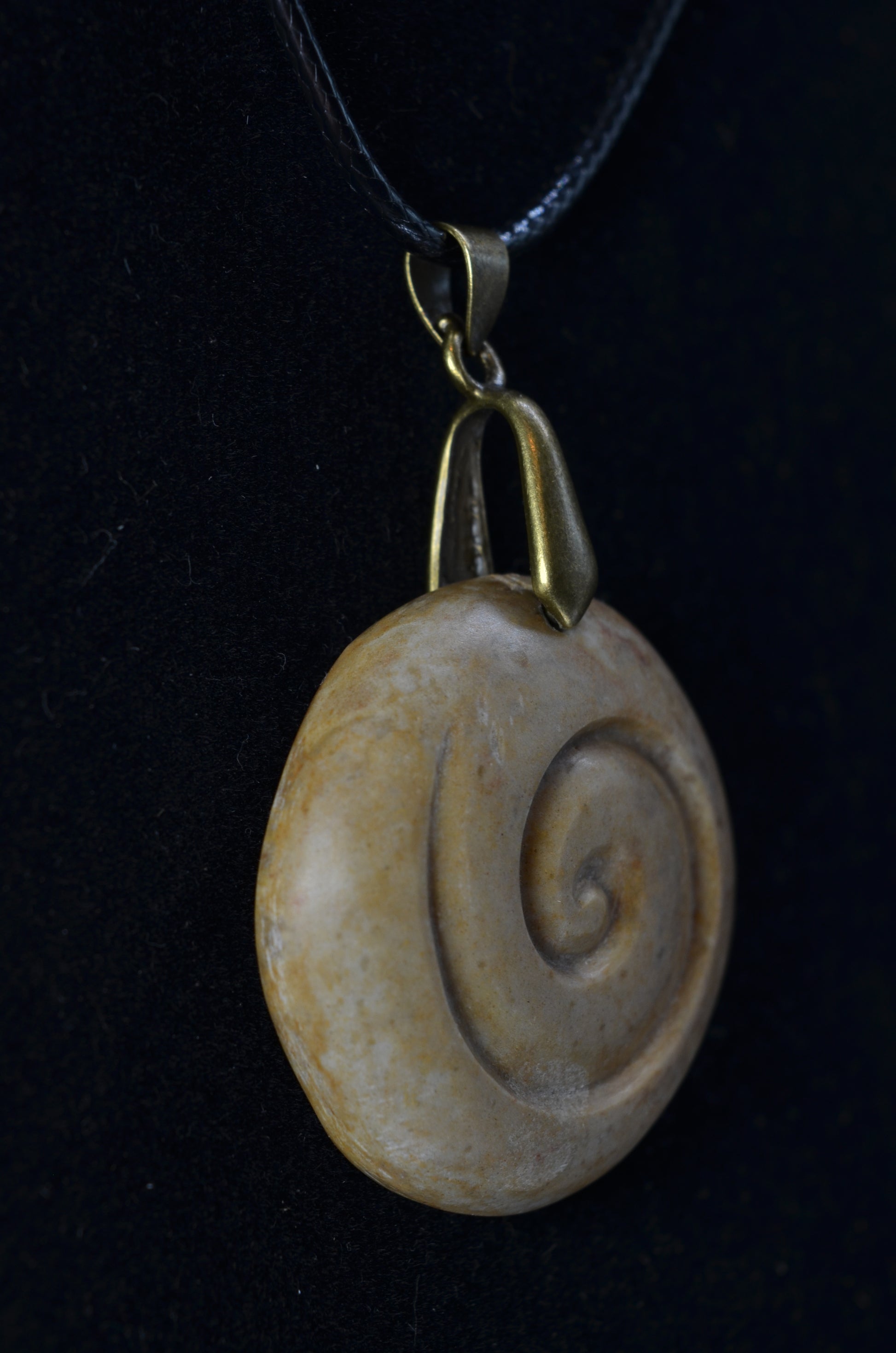 Hand carved Sarsens stone Spiral Pendant (Stonehenge Stone). The back of the pendant has got the original outer layer of the rough stone.