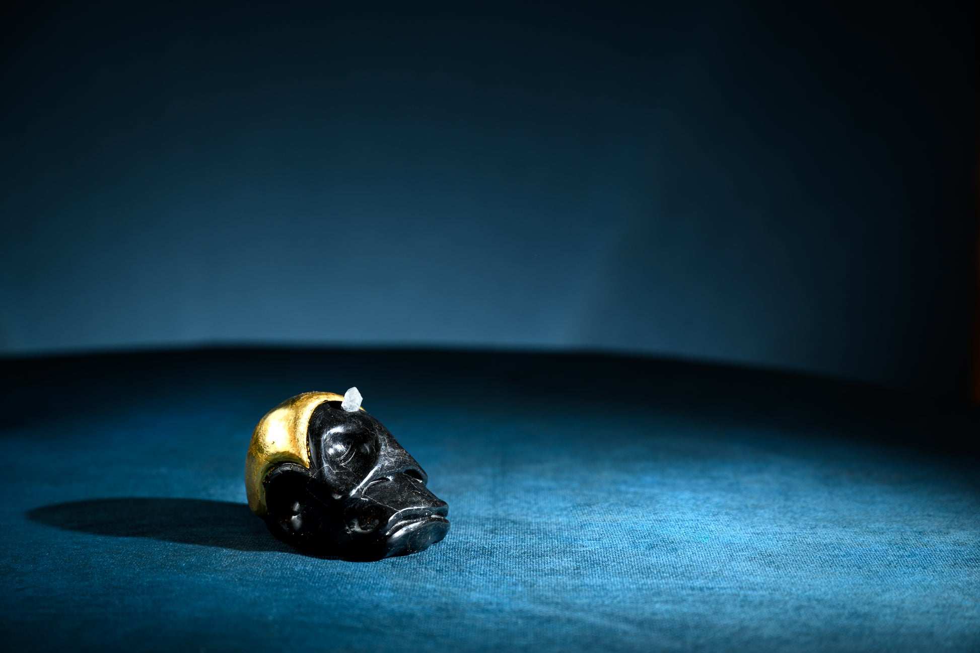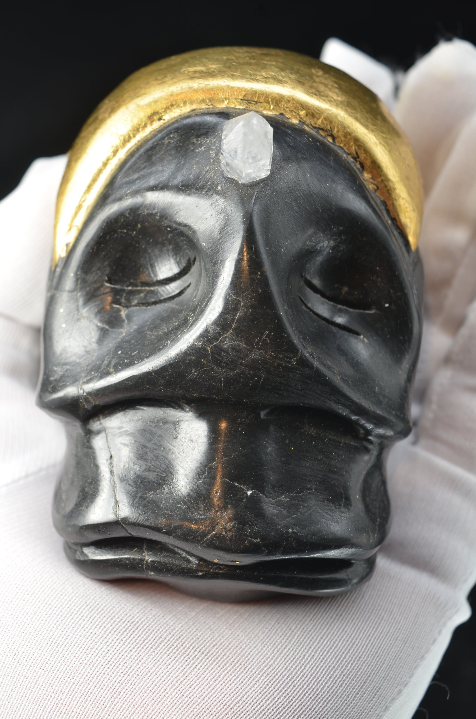 Basalt base, wearing a headdress of gold leaf.